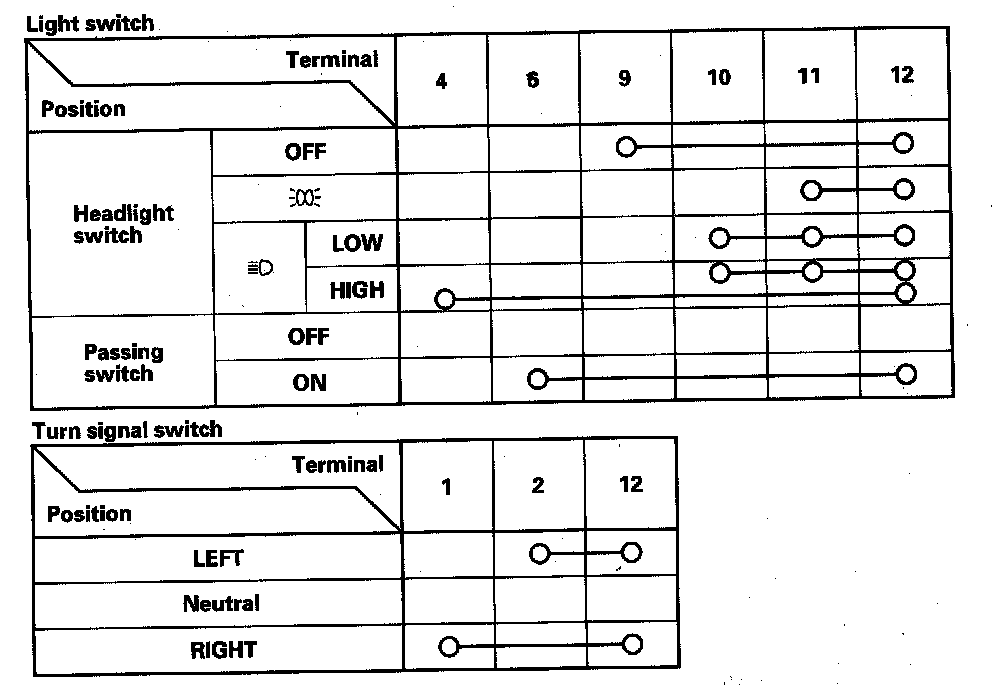 - If the terminals look OK, check for continuity between the terminals in each switch position according to the tables.