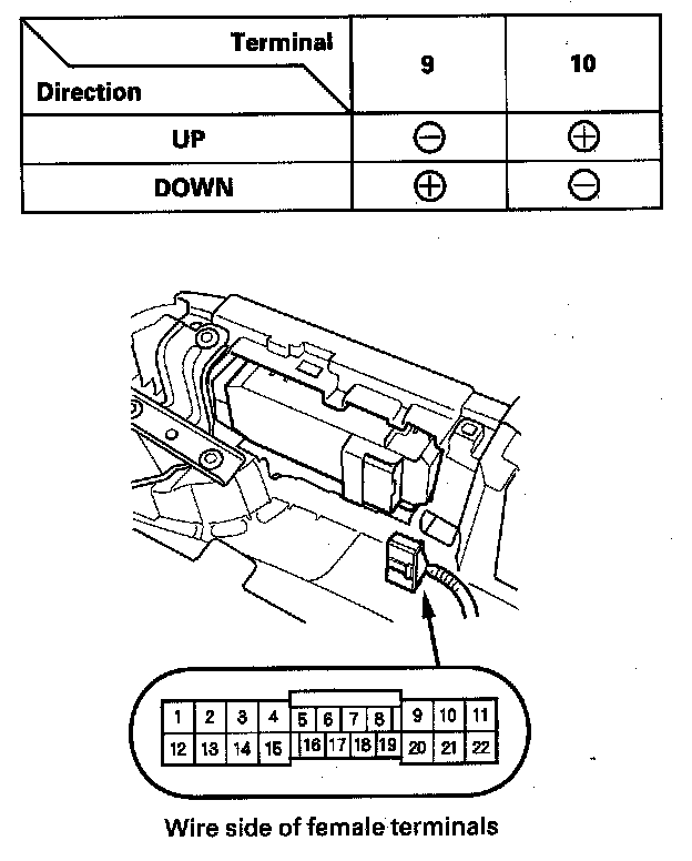 2. Test the motor in each direction by connecting battery power and ground to the power window master switch 22P connector according to the table.