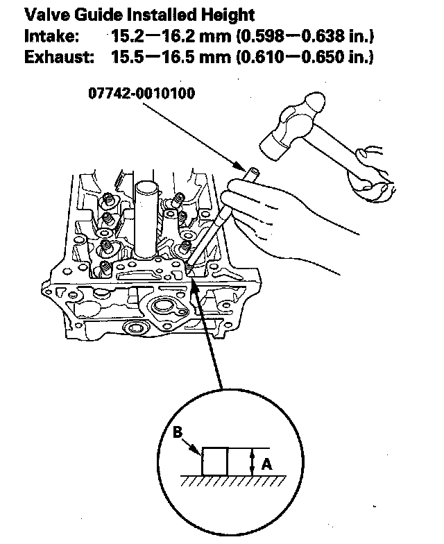 9. Apply a thin coat of new engine oil to the outside of the new valve guide. Install the guide from the camshaft side of the head; use the special tool to drive the guide into the specified installed height (A) of the guide (B). If you have all 16 guides to do, you may have to reheat the head.