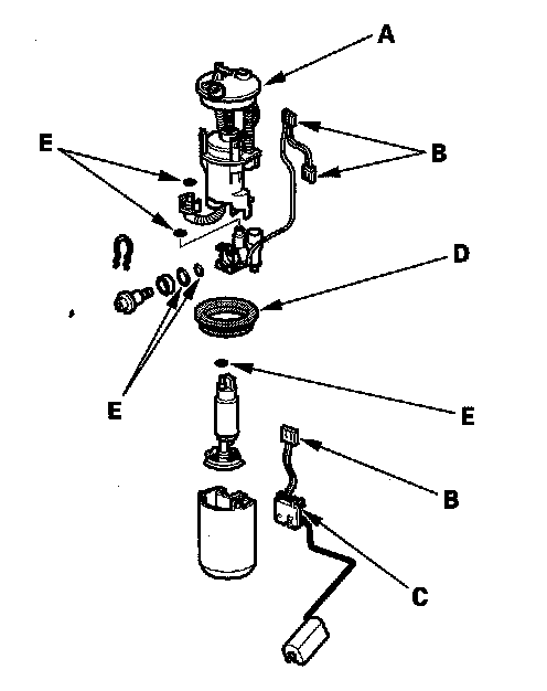 4. Install the parts in the reverse order of removal with a new base gasket (D) and new O-rings (E). When installing the fuel tank unit, align the marks on the unit and the fuel tank.