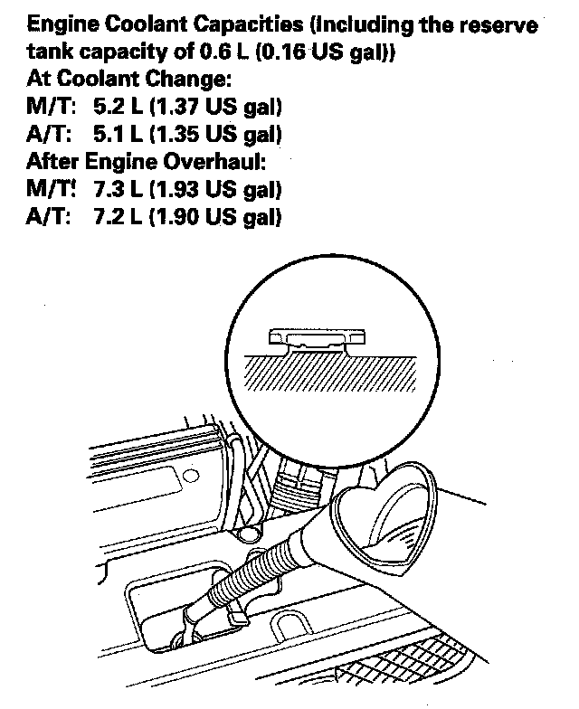 7. Pour Honda Long Life Antifreeze/Coolant Type 2 into the radiator up to the base of the filler neck.