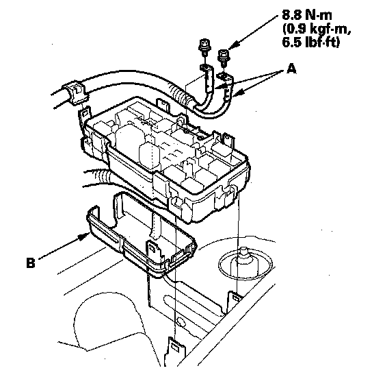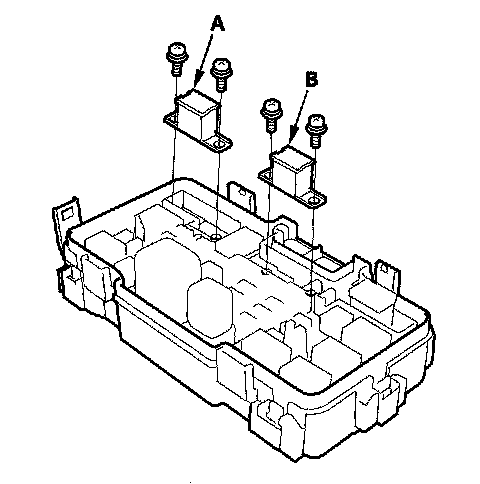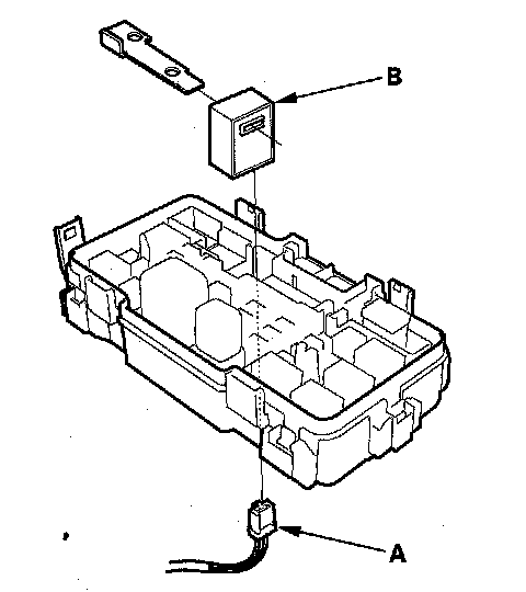 4. Remove the under-hood fuse/relay box lower cover (B) from the fuse/relay box.