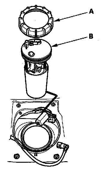 8. Remove the locknut (A) and the fuel tank unit (B).