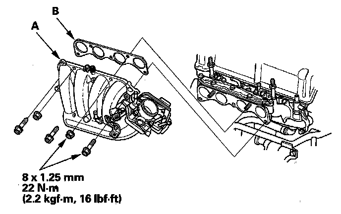 Install the intake manifold (A) with a new gasket (B), and tighten the bolts/nuts in a crisscross pattern in two or three steps, beginning with the inner bolt.