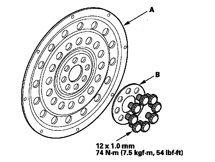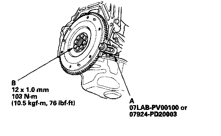 Install the special tool (A), then torque the flywheel mounting bolts (B) in a crisscross pattern in several steps.