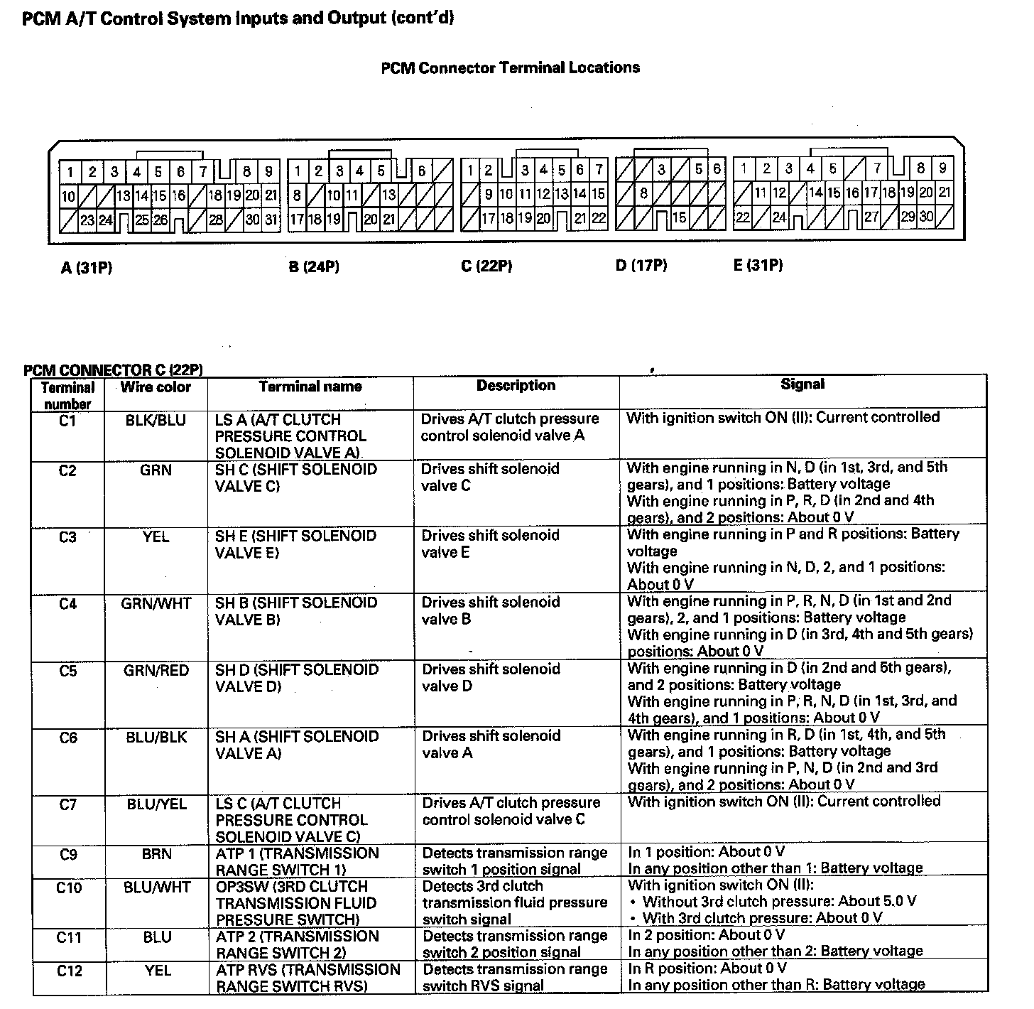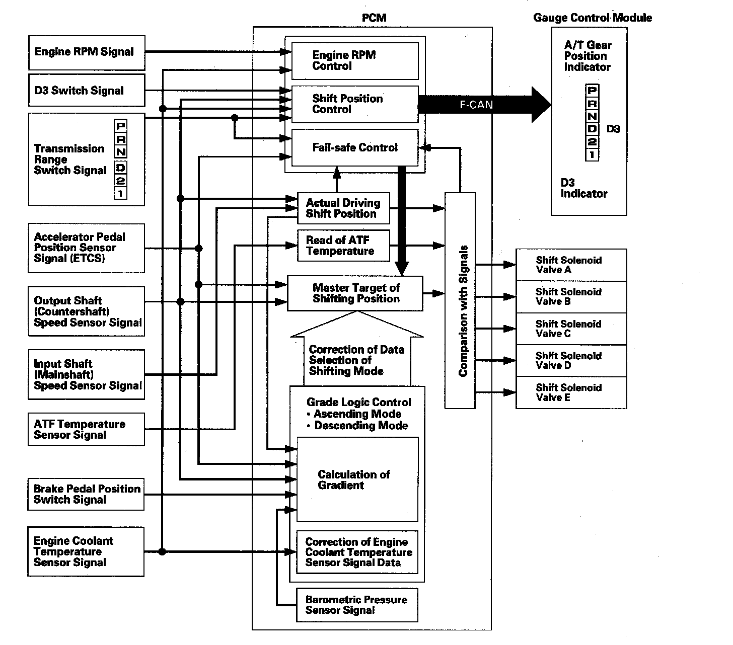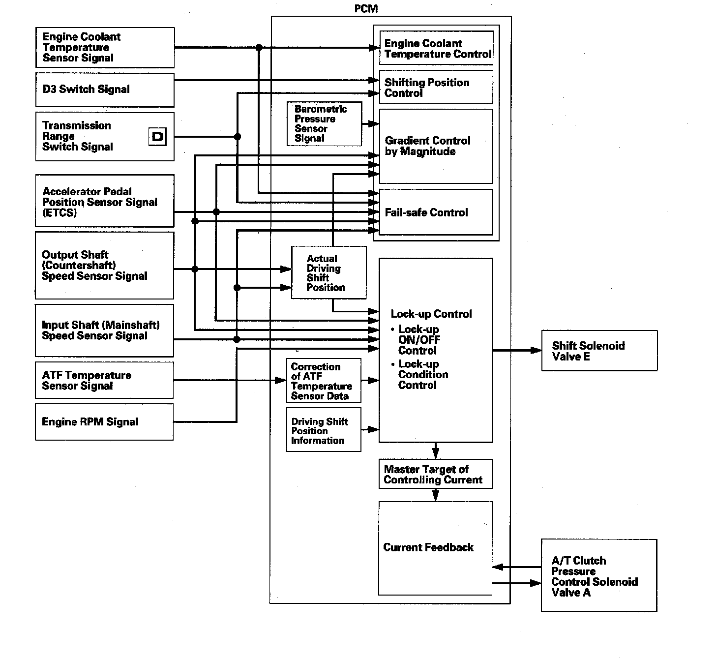 The PCM controls to shift gears shift solenoid valves A, B, C, D, and E, and the A/T clutch pressure control solenoid valves A, B, and C, while receiving input signals from various sensors and switches located throughout the vehicle. The shift solenoid valves shift the positions of the shift valves to switch the port leading hydraulic pressure to the clutch. The A/T clutch pressure control solenoid valves A, B, and C regulate their respective pressure, and pressurize to the clutches to engage it and its corresponding gear. The pressures of the A/T clutch pressure control solenoid valves also apply to the shift valves to switch the port.