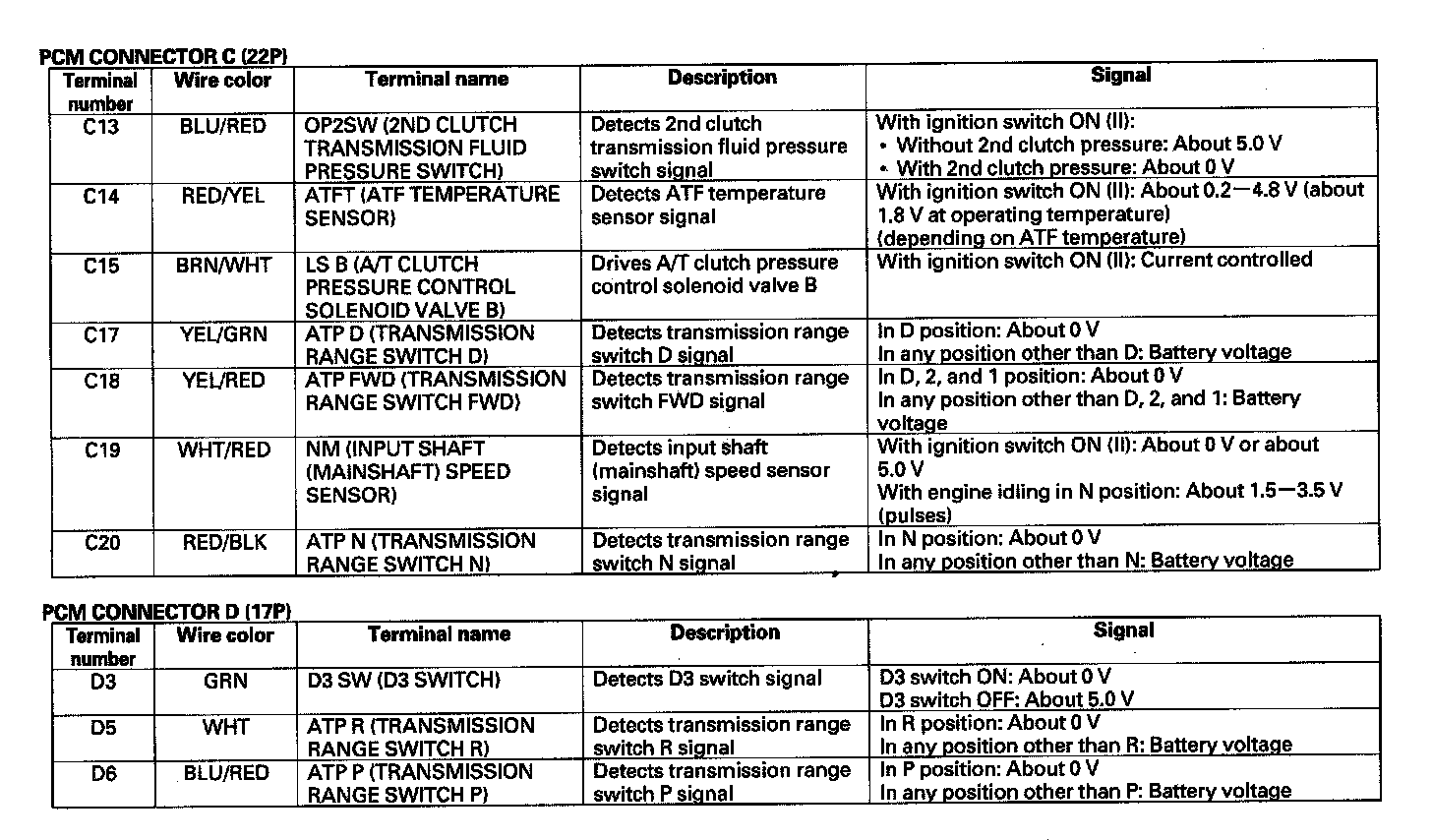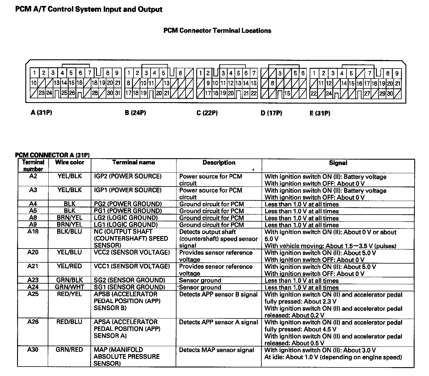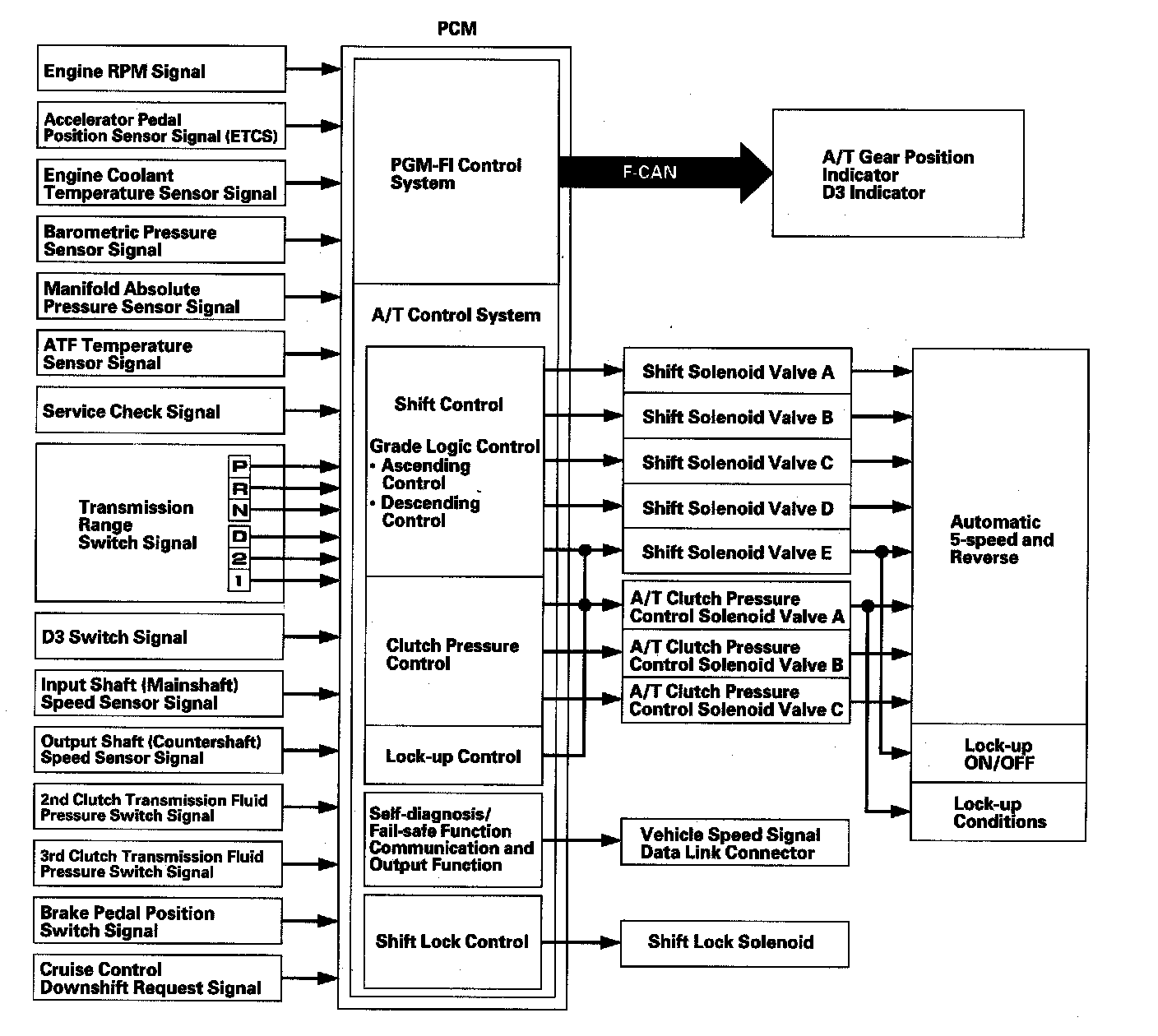 The PCM controls to shift gears shift solenoid valves A, B, C, D, and E, and the A/T clutch pressure control solenoid valves A, B, and C, while receiving input signals from various sensors and switches located throughout the vehicle. The shift solenoid valves shift the positions of the shift valves to switch the port leading hydraulic pressure to the clutch. The A/T clutch pressure control solenoid valves A, B, and C regulate their respective pressure, and pressurize to the clutches to engage it and its corresponding gear. The pressures of the A/T clutch pressure control solenoid valves also apply to the shift valves to switch the port.