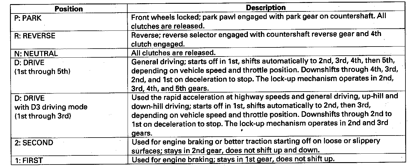 The shift lever has six positions; P: PARK, R: REVERSE, N: NEUTRAL, D: DRIVE 1st through 5th gear range, and 1st through 3rd gear range with D3 driving mode, 2: 2nd gear, and 1: 1st gear.