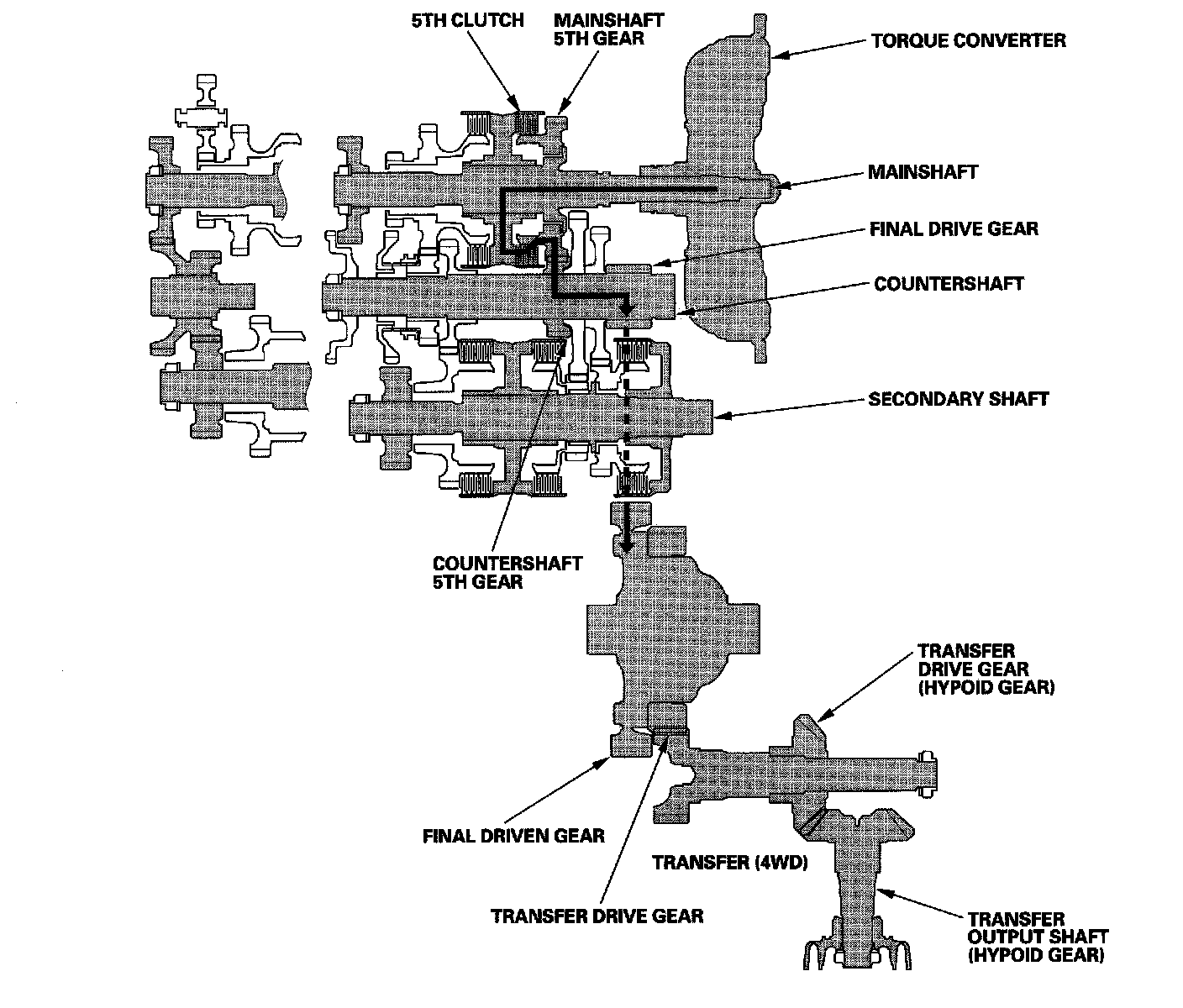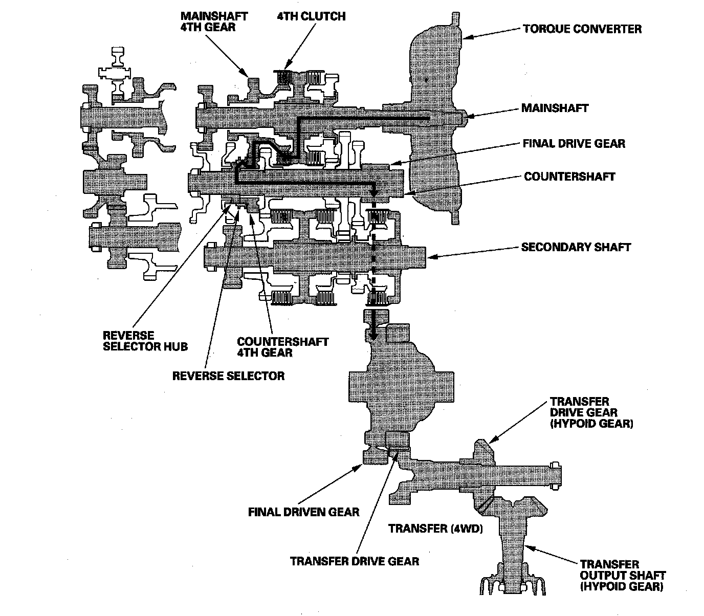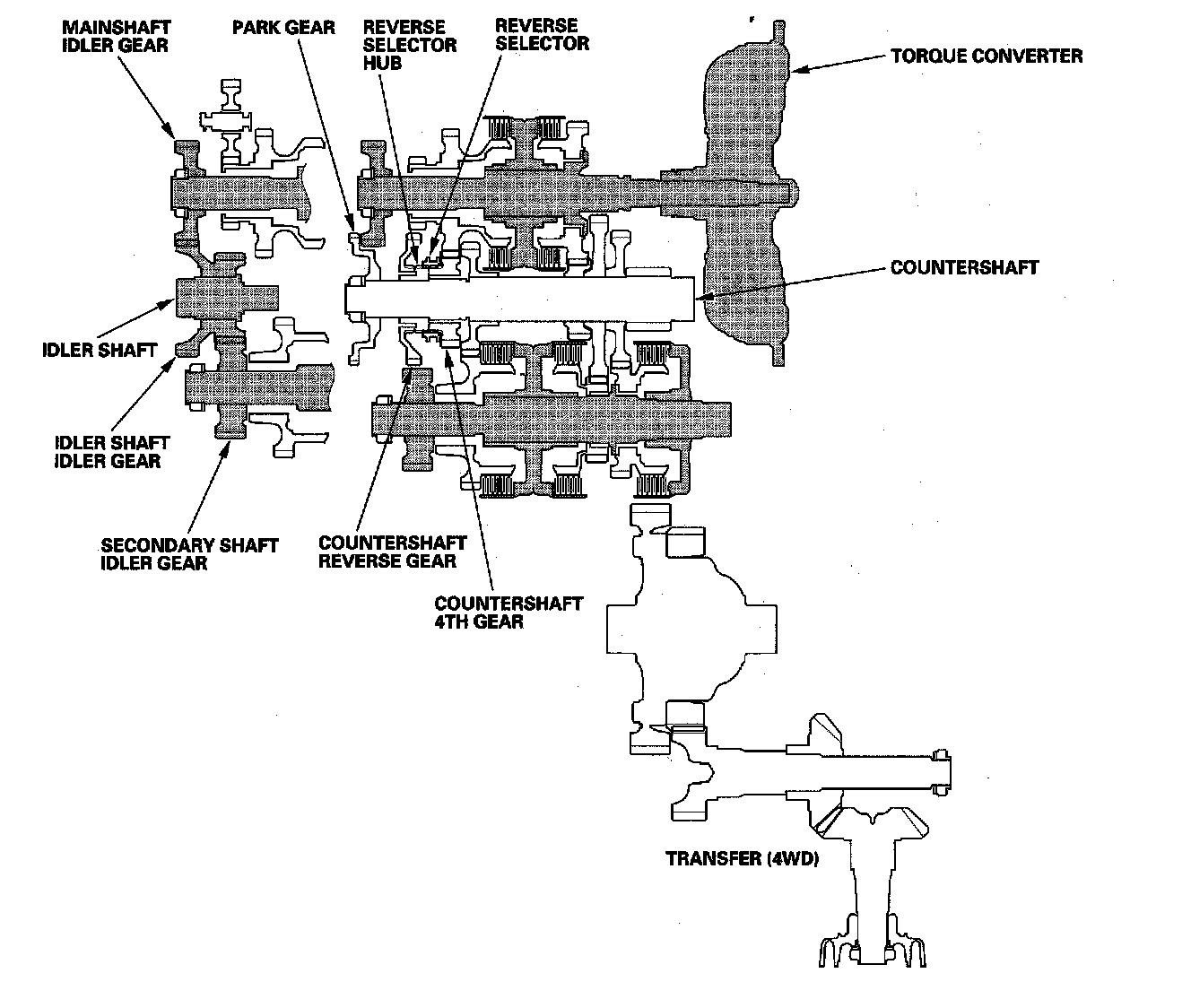 The torque converter consists of a pump, turbine, and stator assembly in a single unit. The converter housing (pump) is connected to the engine crankshaft and turns as the engine turns. Around the outside of the torque converter is a ring gear which meshes with the starter pinion when the engine is being started. The entire torque converter assembly serves as a flywheel while transmitting power to the transmission mainshaft, the transmission has three parallel shafts; the mainshaft, the countershaft, and the secondary shaft. The mainshaft is in line with the engine crankshaft, and includes the 4th and 5th clutches, and gears for 5th, 4th, reverse, and idler. The mainshaft reverse gear is integral with the mainshaft 4th gear. The countershaft includes the gears for 1st, 2nd, 3rd, 4th, 5th, reverse, park, and the final drive. The final drive gear is integral with the countershaft. The countershaft 4th gear and the countershaft reverse gear can be locked to the countershaft providing 4th or reverse gear, depending on which way the selector is moved. The secondary shaft includes the 1st, 2nd, and 3rd clutches, and gears for 1st, 2nd, 3rd, and idler. The idler shaft is located between the mainshaft and secondary shaft, and the idler gear transmits power between the mainshaft and the secondary shaft. The gears on the mainshaft and the secondary shaft are in constant mesh with those on the countershaft. When certain combinations of gears in the transmission are engaged by the clutches, power is transmitted through the mainshaft, then to the secondary shaft to the countershaft or through the mainshaft to the countershaft to provide drive.
