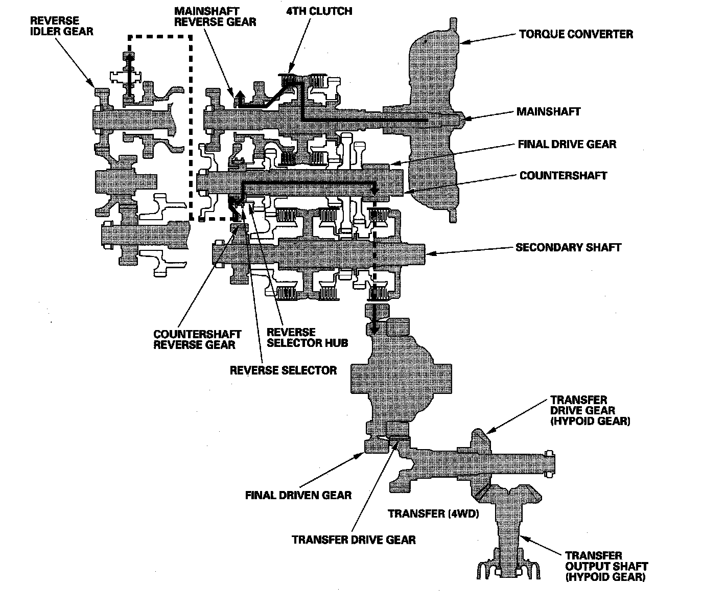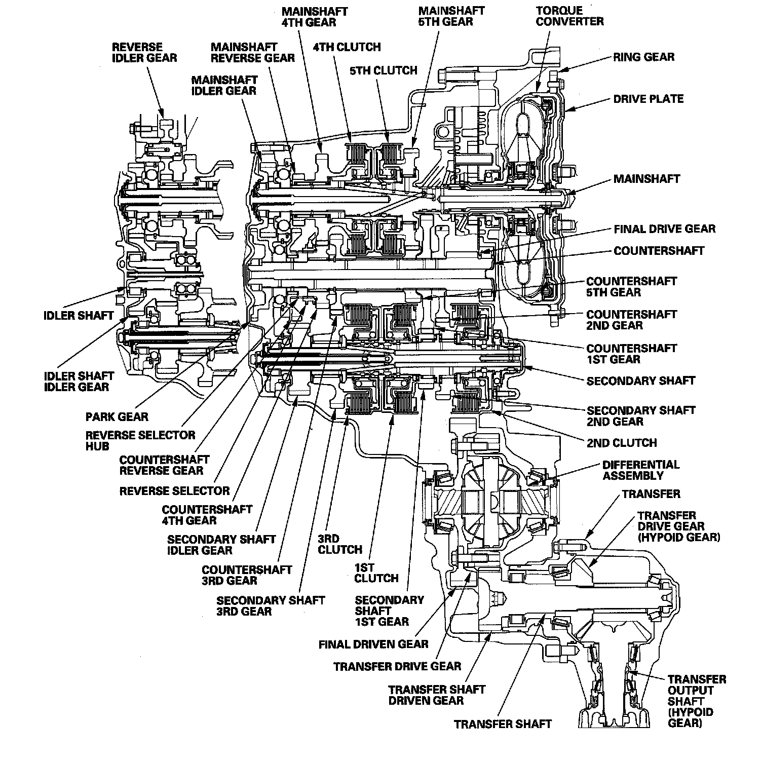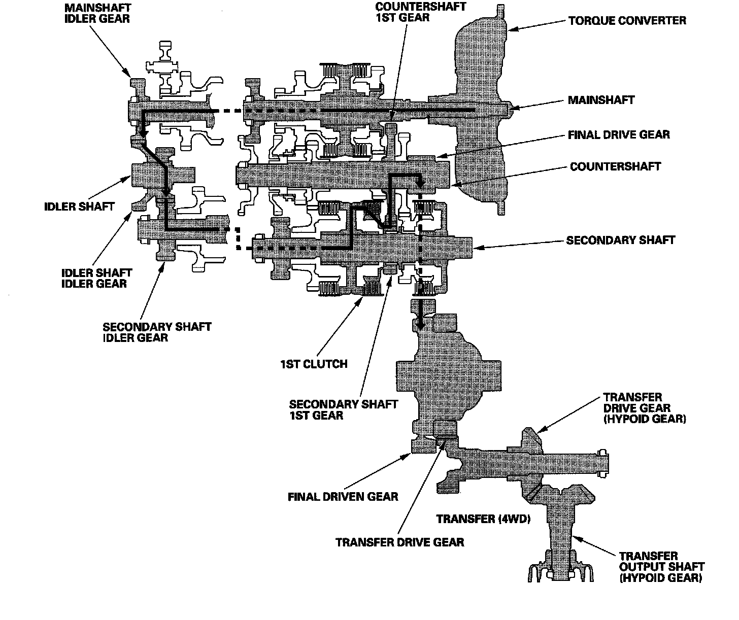 The torque converter consists of a pump, turbine, and stator assembly in a single unit. The converter housing (pump) is connected to the engine crankshaft and turns as the engine turns. Around the outside of the torque converter is a ring gear which meshes with the starter pinion when the engine is being started. The entire torque converter assembly serves as a flywheel while transmitting power to the transmission mainshaft, the transmission has three parallel shafts; the mainshaft, the countershaft, and the secondary shaft. The mainshaft is in line with the engine crankshaft, and includes the 4th and 5th clutches, and gears for 5th, 4th, reverse, and idler. The mainshaft reverse gear is integral with the mainshaft 4th gear. The countershaft includes the gears for 1st, 2nd, 3rd, 4th, 5th, reverse, park, and the final drive. The final drive gear is integral with the countershaft. The countershaft 4th gear and the countershaft reverse gear can be locked to the countershaft providing 4th or reverse gear, depending on which way the selector is moved. The secondary shaft includes the 1st, 2nd, and 3rd clutches, and gears for 1st, 2nd, 3rd, and idler. The idler shaft is located between the mainshaft and secondary shaft, and the idler gear transmits power between the mainshaft and the secondary shaft. The gears on the mainshaft and the secondary shaft are in constant mesh with those on the countershaft. When certain combinations of gears in the transmission are engaged by the clutches, power is transmitted through the mainshaft, then to the secondary shaft to the countershaft or through the mainshaft to the countershaft to provide drive.