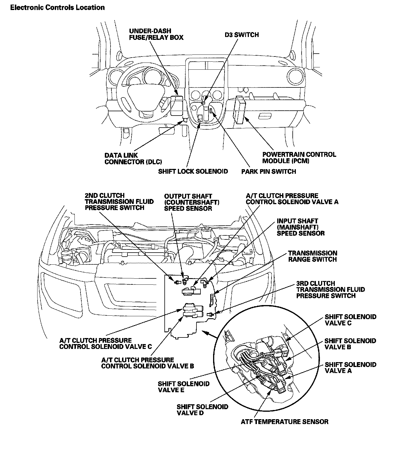 The electronic control system consists of the powertrain control module PCM sensors, and solenoid valves. Shifting and lock-up are electronically controlled for comfortable driving under all conditions. The PCM is located below the dashboard, under the front lower panel behind the center console.