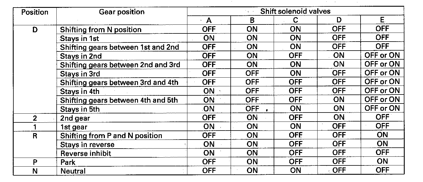 The PCM turns the shift solenoid valves A, B, C, D, and E ON and OFF to control transmission gear shifting. The combination of driving signals to shift solenoid valves A, B, C, D, and E are shown in the table.