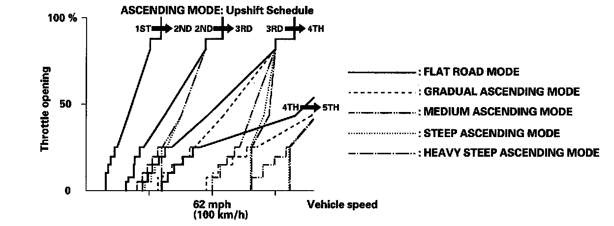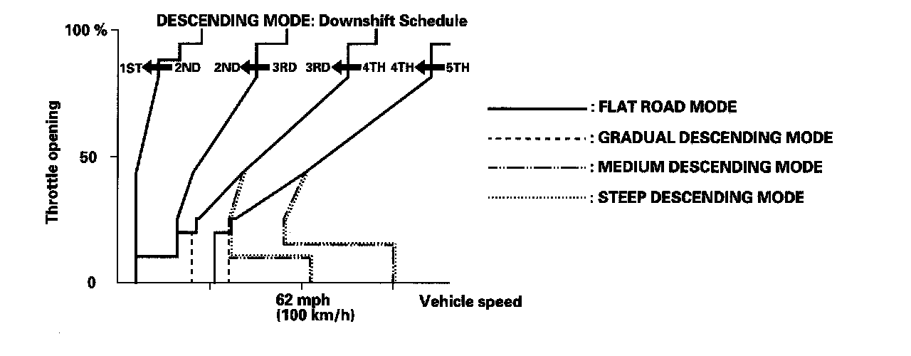 When the PCM determines that the vehicle is going down a hill in the D position, the shift-up speed from 4th to 5th gear, from 3rd to 4th gear, and from 2nd to 3rd gear (when the throttle is closed) becomes faster than the set speed for flat road driving to widen the 4th gear, 3rd gear, and 2nd gear driving area. This, in combination with engine braking from the deceleration lock-up, achieves smooth driving when the vehicle is descending. There are three descending modes with different 4th gear driving areas, 3rd gear driving areas, and 2nd gear driving areas according to the magnitude of a gradient stored in the PCM. When the vehicle is in 5th gear or 4th gear, and you are decelerating when you are applying the brakes on a steep hill, the transmission will downshift to lower gear. When you accelerate, the transmission will then return to a higher gear.