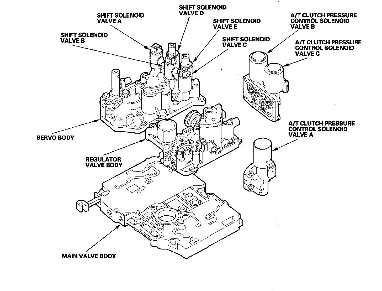 The valve body includes the main valve body, the regulator valve body, and the servo body. The ATF pump is driven by splines on the left end of the torque converter which is attached to the engine. Fluid flows through the regulator valve to maintain specified pressure through the main valve body to the manual valve, directing pressure to the shift valves and to each of the clutches via the solenoid valves. The shift solenoid valves A, B C, D, and E are bolted on the servo body. The A/T clutch pressure control solenoid valves A, B, and C are mounted on the outside of the transmission housing.