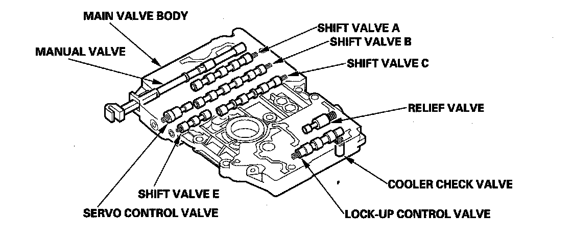 The main valve body contains the manual valve, the shift valves A, B, C, and E, the relief valve, the lock-up control valve, the cooler check valve, the servo control valve, and the ATF pump gears. The primary function of the main valve body is to switch fluid pressure on and off and to control hydraulic pressure going to the hydraulic control system.