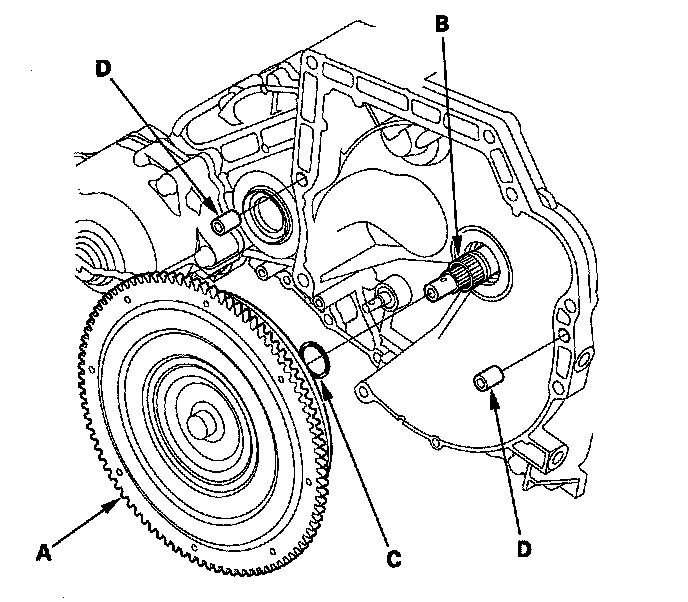 6. Install the 14 x 20 mm dowel pins (D) in the torque converter housing.