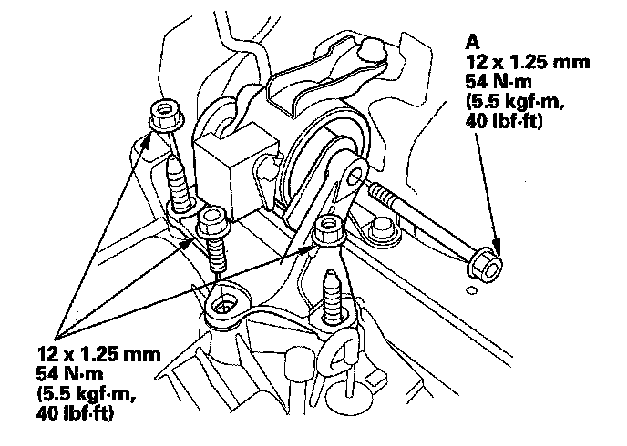 11. Install the transmission mount bracket. Tighten the mount bolt (A) loosely, and tighten the transmission mount bracket bolt and nuts to the specified torque, then tighten the mount bolt to the specified torque.