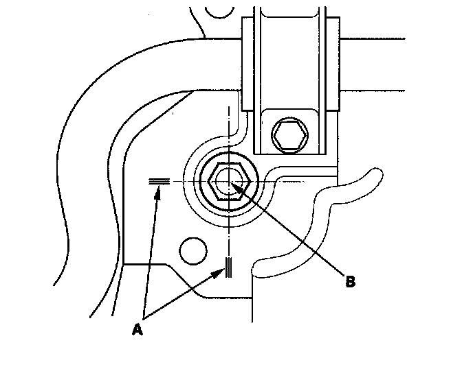 21. Align the reference marks (A) with the center of the front subframe mounting bolts (B), then tighten the bolts to the specified torque.