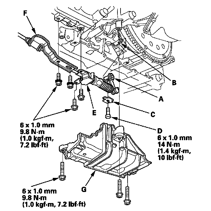26. Install the shift cable holder (E) and the shift cable bracket (F), then install the shift cable cover (G).