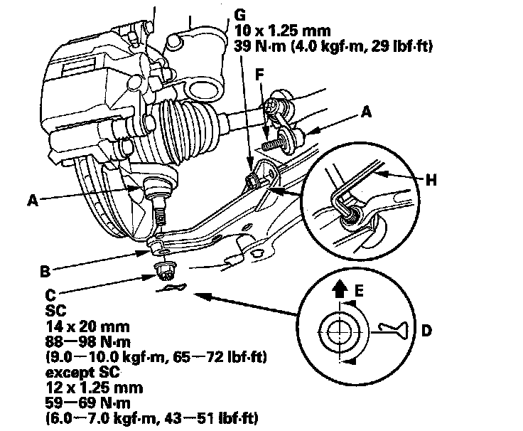30. Connect the ball joints (F) to the lower arms, and install the nuts (G). Insert a 5 mm hex wrench in the top of the ball joint pins, and tighten the nuts.