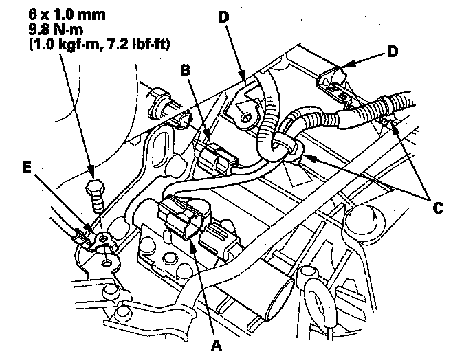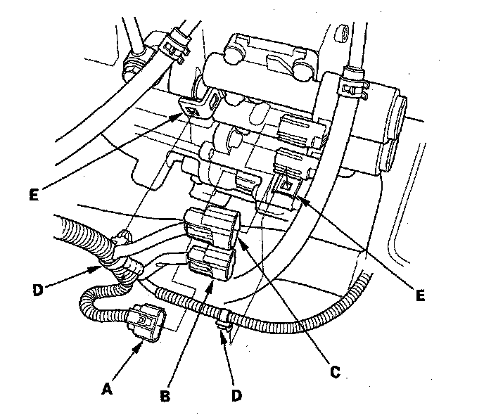 34. Connect the shift solenoid harness connector (A), A/T clutch pressure control solenoid valve B connector (B), and solenoid valve C connector (C). Install the harness clamps (D) on the clamp brackets (E).