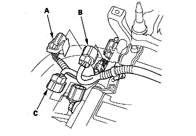 38. Connect the A/T clutch pressure control solenoid valve A connector (A) and 2nd clutch transmission fluid pressure switch connector (B), and install the harness clamps (C) on the clamp brackets (D).