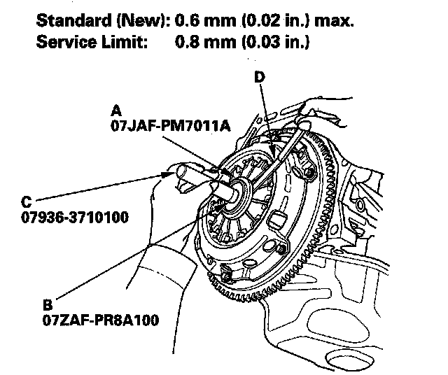 1. Check the height of the diaphragm spring fingers using the clutch alignment disc (A), clutch alignment shaft (B), remover handle (C), and a feeler gauge (D). If the height is more than the service limit, replace the pressure plate.