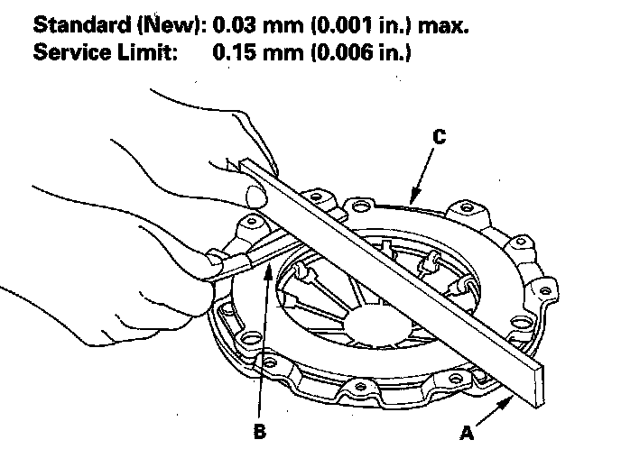 6. Inspect for warpage using a straight edge (A) and a feeler gauge (B). Measure across the pressure plate (C). If the warpage is more than the service limit, replace the pressure plate.