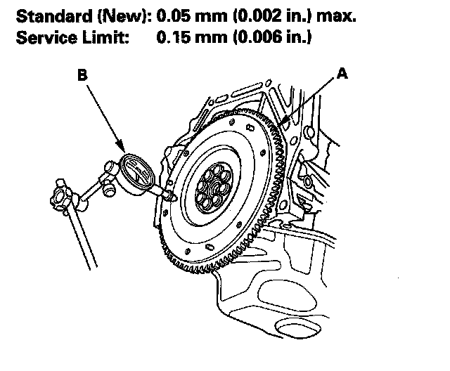 3. Measure the flywheel (A) runout using a dial indicator (B) through at least two full turns with the engine installed. Push against the flywheel each time you turn it to take up the crankshaft thrust washer clearance. If the runout is more than the service limit, replace the flywheel, and recheck the runout. Resurfacing the flywheel is not recommended.