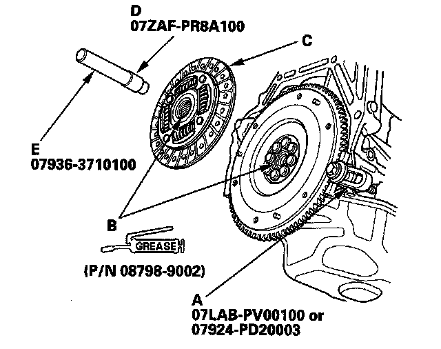 3. Apply super high temp urea grease (P/N 08798-9002) to the splines (B) of the clutch disc (C), then install the clutch disc using the clutch alignment shaft (D) and remover handle (E).