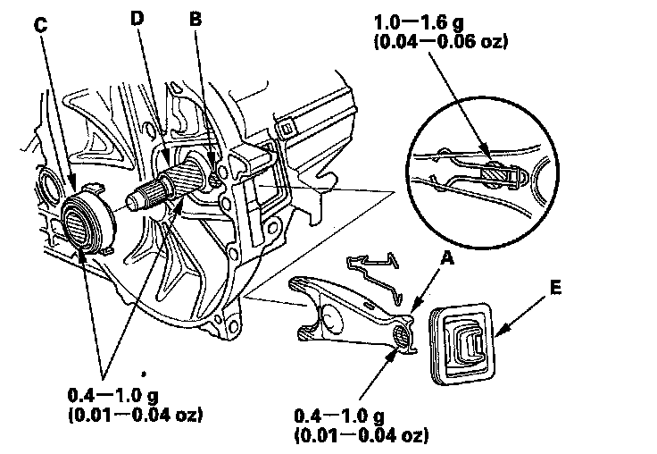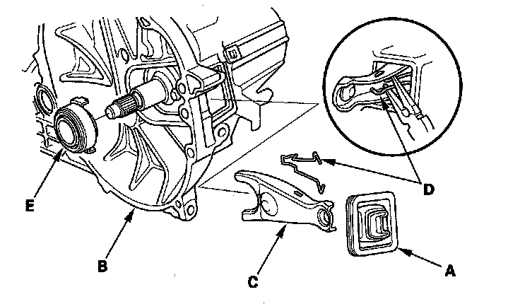 2. Remove the release fork (C) from the clutch housing by squeezing the release fork set spring (D) with pliers. Remove the release bearing (E).