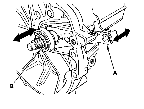 8. Move the release fork (A) right and left to make sure it fits properly against the release bearing (B) and the release bearing slides smoothly.