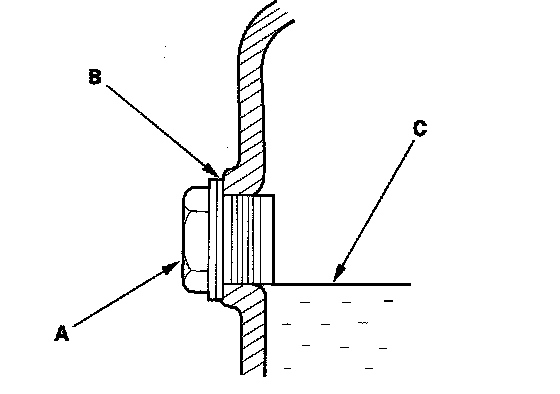 2. Remove the filler plug (A) and washer (B), check the condition of the fluid, and make sure it is at the proper level (C).
