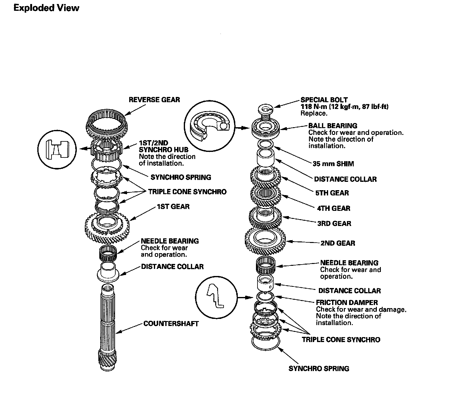2. Install the distance collar, needle bearing, and 1st gear onto the countershaft.