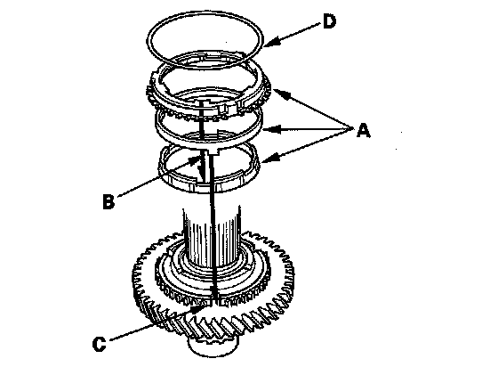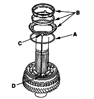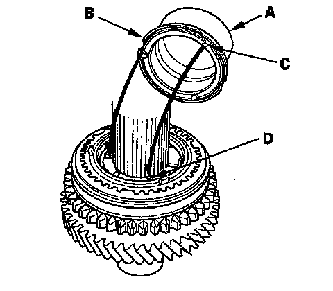 3. Install the triple cone synchro assembly (A) by aligning the synchro cone fingers (B) with the grooves in 1st gear (C), then install the synchro spring (D).