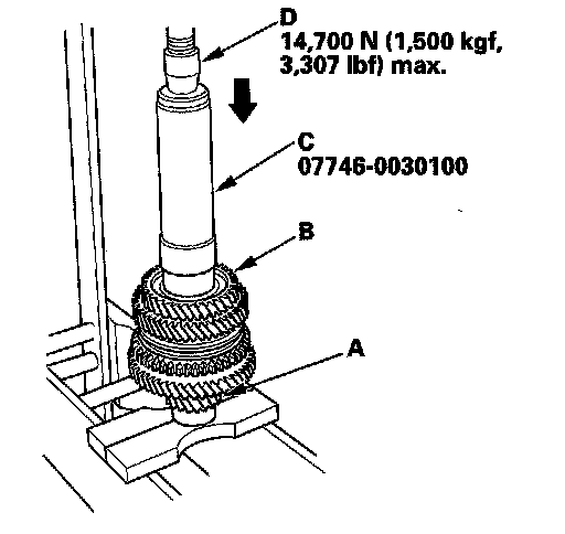 12. Install 4th gear (A) using the 40 mm I.D. driver (B) and a press (C).
