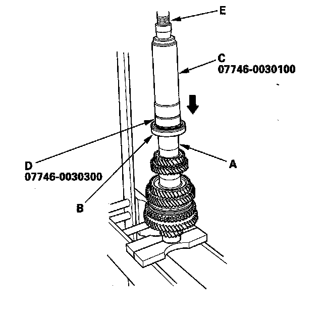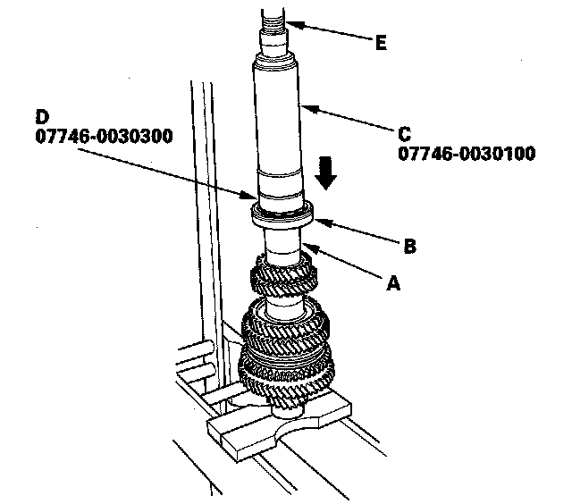 19. Install the distance collar (A), 35 mm shim, and new ball bearing (B) using the 40 mm I.D. driver (C), 30 mm I.D. attachment (D), and a press (E), then recheck the clearance.