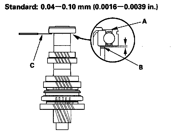 15. Measure the clearance between the old bearing (A) and the 35 mm shim (B) with a feeler gauge (C).