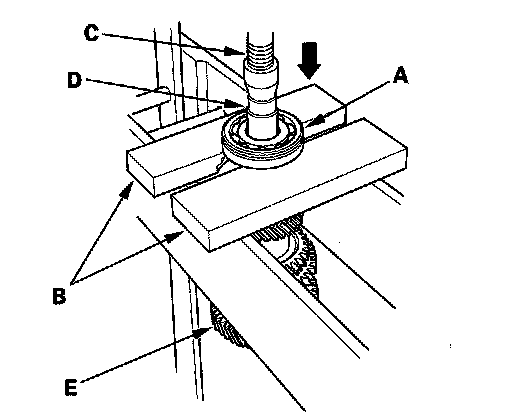 17. Support the ball bearing (A) on steel blocks (B), then use a press (C) and an attachment (D) to press the countershaft (E) out of the ball bearing.