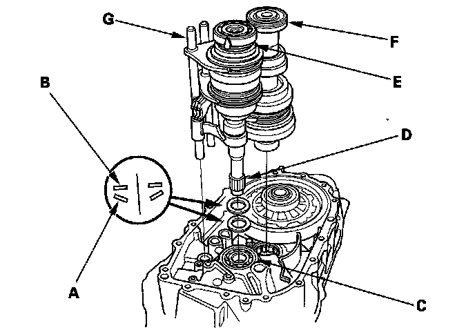 3. Apply tape to the mainshaft splines (D) to protect the seal Install the mainshaft assembly (E) and countershaft assembly (F) into the shift fork assembly (G), as an assembly.