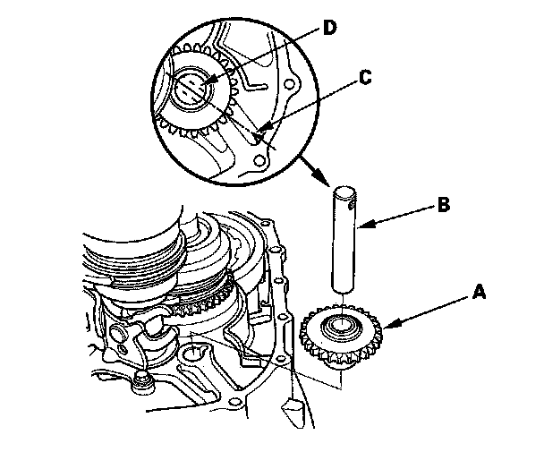5. Install the reverse idler gear (A) and reverse gear shaft (B) by aligning the mark (C) with the reverse gear shaft hole (D).