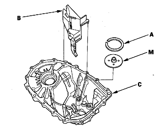 7. Select the proper size 72 mm shim (A) according to the measurements made during the Mainshaft Thrust Clearance Adjustment. Install the oil gutter plate (B), oil guide plate M, and 72 mm shim into the transmission housing (C).