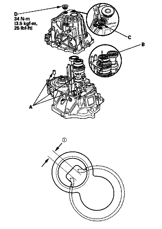 13. Apply liquid gasket (P/N 08718-0001 or 08718-0002) to the threads of the 32 mm sealing cap (D), and install it on the transmission housing.
