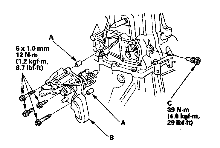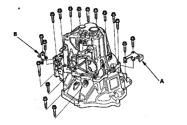 14. Install transmission hangers A, B, and the 8 mm flange bolts, finger-tight.