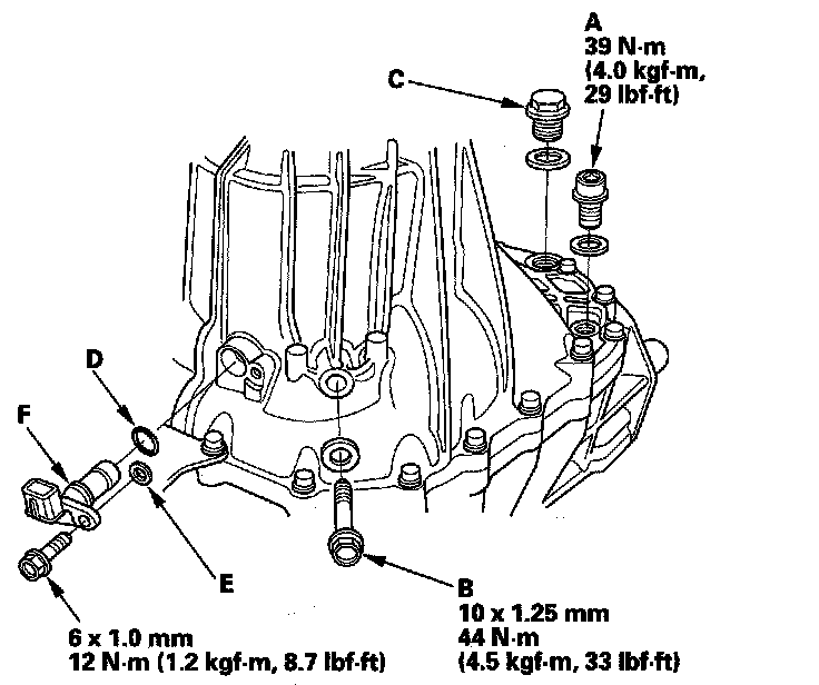 20. Apply manual transmission fluid (MTF) to the new O-ring (D). Then install the new O-ring, the plain washer (E), and the output shaft (countershaft) speed sensor (F).