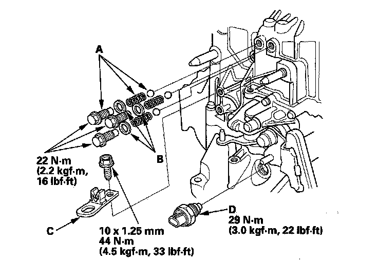 22. Apply liquid gasket (P/N 08718-0001 or 08718-0002) to the threads of the back-up light switch (D), and install the switch on the transmission housing.
