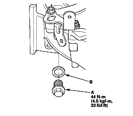 19. Install the drain plug (A), and 10 mm flange bolt (B) with new washers. Install the filler plug (C) finger tight.