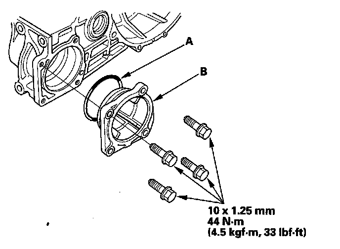 25. 2WD model: Apply manual transmission fluid (MTF) to the new O-ring (A). Then install the new O-ring and the side cover (B).