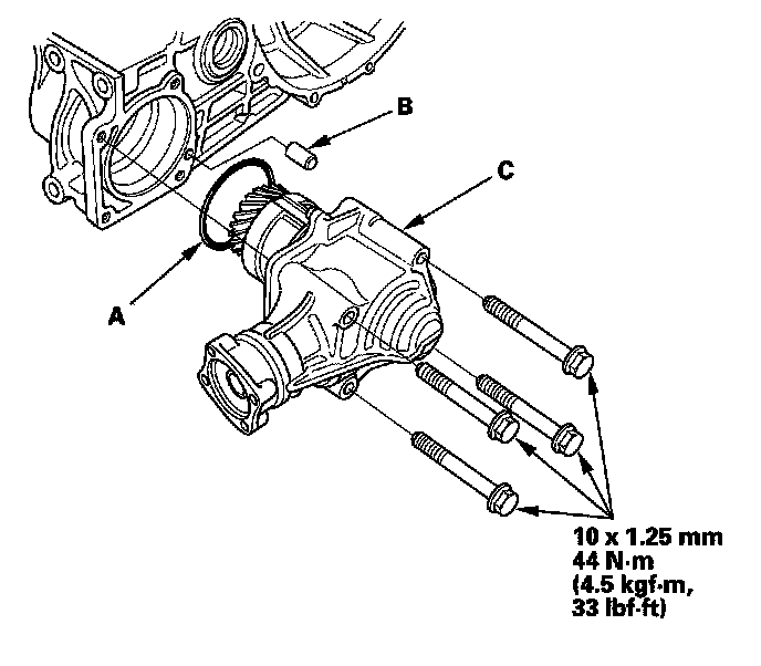 26. 4WD model: Apply manual transmission fluid (MTF) to the new O-ring (A). Then install the new O-ring, 10 x 20 mm dowel pin (B), and the transfer assembly (C).