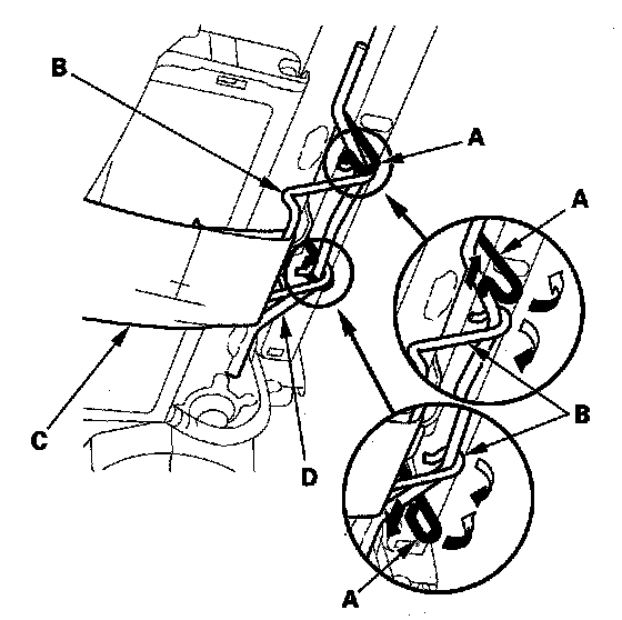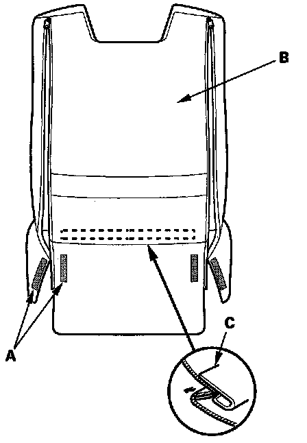 10. Release the front hook (A) and rear hook (B) of the reinforcing cloth (C) from the seat-back frame (D).